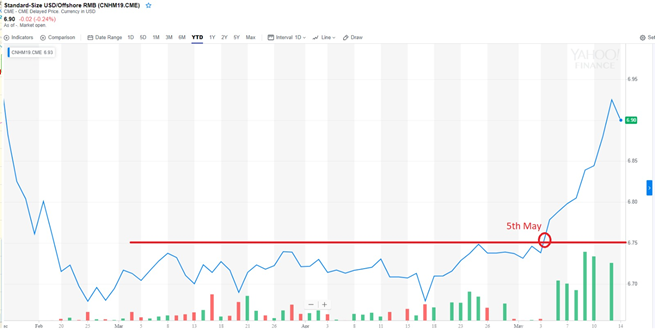 特朗普於香港時間5月5日突然在Twitter發文,明言在5月10日起把目前針對2000億美元中國進口商品加徵的10%關稅,將提升至25%。消息傳出後人民幣兌美元匯率一直走弱,於周一更跌至6.92水平,離岸人民幣連跌6日,跌至5個月來低位。如美國執行對所有中國貨品加徵關稅,人民幣匯率跌穿7算只是時間問題。投資者要注意受人民幣貶值影響之相關股票,如內地航空股、紙業股、內房股等,定會受負面影響。
