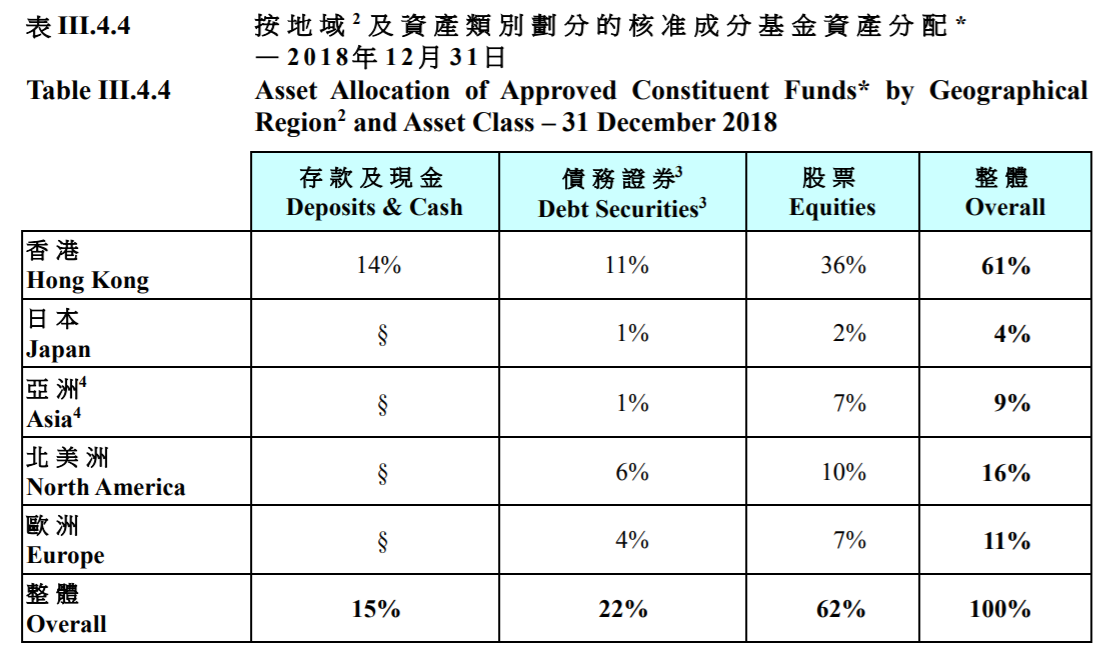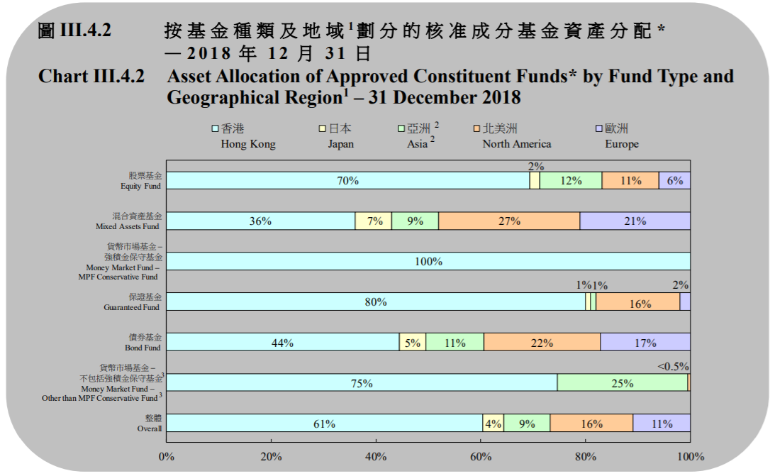 積金局上週公佈了至5月底的強積金最新統計數字(見圖一),核准成份基金的數目為476,佔比最多的是混合資產基金(209),其後是股票基金(162),總共佔了基金總數目的78%。而根據2019年3月的強積金計劃統計摘要資料,61%的強積金資產是投放在本港區內,排第二的北美洲只有16%,第三的歐洲10%。投放於香港的資產比例次序分別是38%股票,14%存款及現金,和11%債券證券。