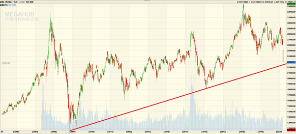 港股方面,受美股暴瀉拖累,在黑色星期五(13/3)港股裂口低開1789點,22500點水平開市,圖表中從2009年金融海嘯的底部畫出一條長期支持位,今早開市已達,可嘗試在23000以下造好。