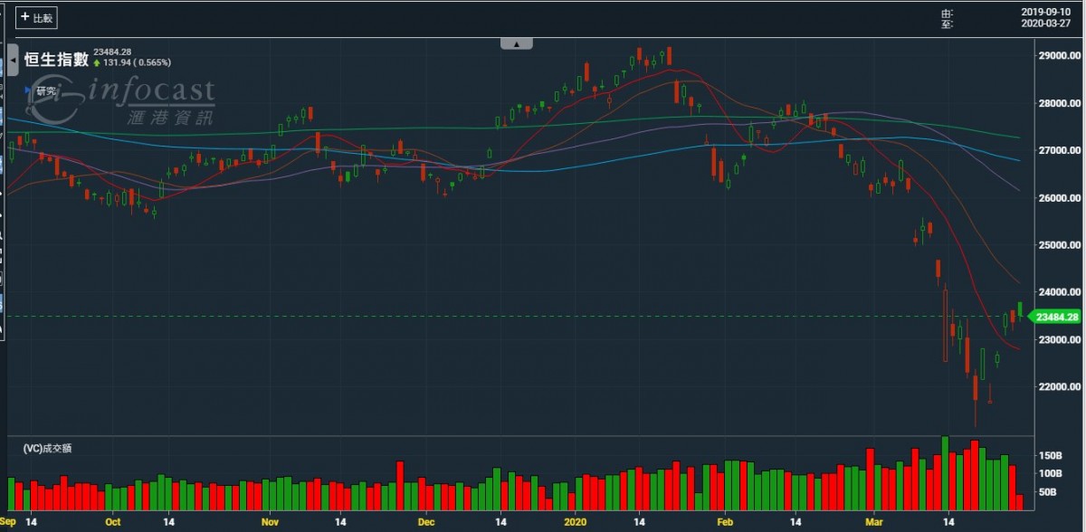 受美股大幅反彈所刺激,港股亦順勢作進一步之反彈,而恆指更於3月25日重越10天線(約在23846點左近)。單從走勢上看,由於恆指現已漸升離3月19日之低位21139點,故整個大巿暫已漸擺脫續尋底之弱態,相對恆指於26日曾一度高見23604點計,即距底達2465點,故只要恆指能續穩守於10天線之上,即表示整個大市該可先喘定下來再待變化。再從技術上看,大市自今年1月20日高位29174點開始之跌浪,至3月19日低位21139點止計,累積跌幅已達8035點。論幅度當已可滿足中期跌浪之所需,或者大市已出現首隻跌浪之左腳,未來即使再見反覆而回落,可能只是尋找另一隻跌市之右腳,問題只是右腳會否在左腳之上而已。