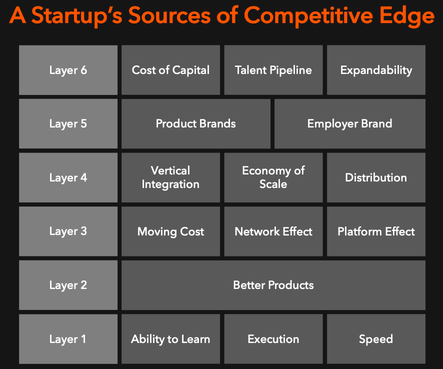 今天把初級到高級的六層競爭力一次攤開來看,是希望提醒創業者,除了快速穩健的建立下層優勢,也應該練習養成更長線的思考,為未來堆疊更強勢的競爭力做準備。