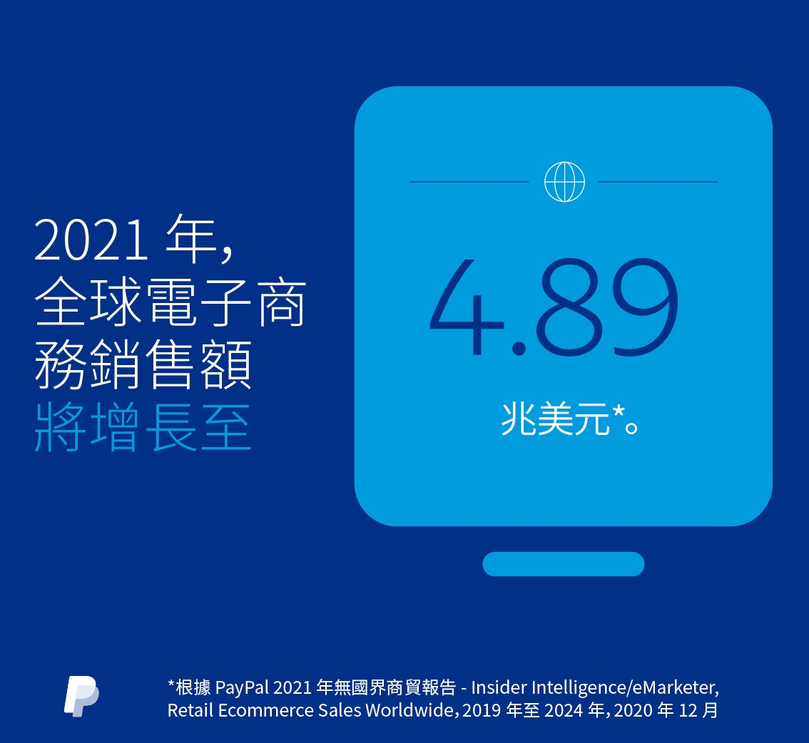當疫情重創全球零售業之際,電子商務市場卻迎來了巨大的新機遇。PayPal 《2021 年無國界商務報告》1指出,全球零售電子商務銷售額由2019年的3.35兆美元,激增28%至2020年的4.28兆美元,估計今年全年的銷售額可按年再增14.3%,達至4.89兆美元水平。數據同時預測有關銷售額未來3年將穩步上揚,反映全球電子商務市場維持迅速增長的趨勢。