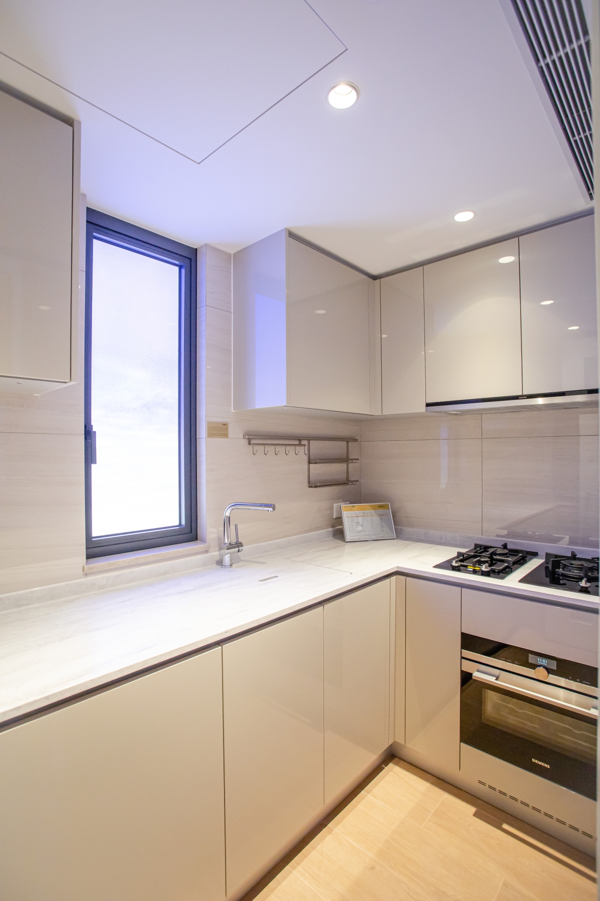 單位大門右方的廚房,採梗廚設計,備有3邊工作檯,配備米白色廚櫃,並附以一系列西門子家電,當中包括雙頭氣體煮食爐、抽油煙機、雪櫃連冰箱、蒸焗爐、洗衣乾衣機,可謂一應俱全。