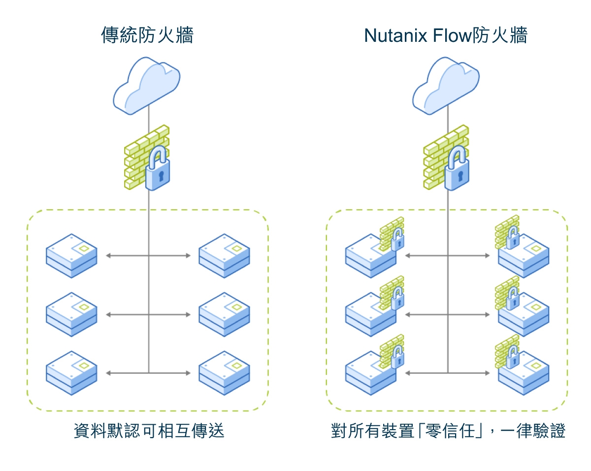 有別傳統防火牆,Nutanix Flow的安全原則以VM及應用程式為基礎,它允許管理員對VM或應用程式進行分類,並套用不同的網絡安全原則,只容許指定流量通過;甚至當員工居家辦公,也能即時派發網路微切分安全政策到其VM,達到一致性防護,所有原則在套用後均可按需要修改。此外,透過微網絡切分還可以快速找出潛在的網絡威脅,迅速隔離出現問題的VM,提升企業維持穩定度。