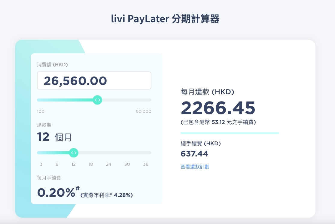 ^livi PayLater的每月手續費低至0.20%,按該筆交易的總金額計算,並須與每期分期還款一併支付。例如,若一筆交易的總金額為港幣1,200元,每月手續費的費率為0.20%,每月手續費即港幣2.4元 (港幣1,200 元x 0.20%)。