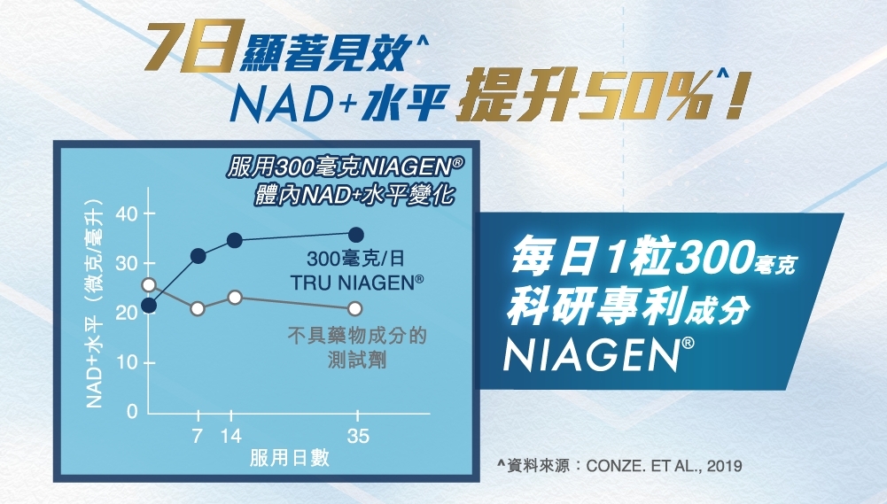 遺傳學權威博士DR. Charles Brenner是NAD+諾加因子代謝研究的權威,曾發表多篇諾加因子學術著作,經多年研究取得突破性成果,帶來全球唯一科研專利成分NIAGEN®(即煙醯胺核糖苷 NICOTINAMIDE RIBOSIDE,簡稱NR)。這種獨特的微量營養素,經多項臨床試驗及安全審查,證實分子可直接進入細胞,有效提升體內NAD+水平,喚醒人體37萬億細胞。每日吸收300毫克NIAGEN®,體內NAD+水平可大大提升50%^。