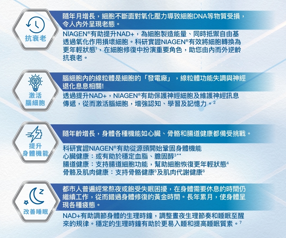 人體活力充沛,有賴三十七萬億細胞每日不停健康地運作,而細胞需要因子驅動轉化為能量,才能維持人體日常運作。研究發現,NAD+ 正是發動這些「細胞引擎」的重要因子、更在許多人體關鍵的化學過程中充當著輔酶的角色,包括進行DNA修復。故體內NAD+水平不足會影響器官正常運作,有機會引發各種導致與年齡相關的疾病如心血管疾病、神經退行性疾病等,以及各種常見「都市毛病」包括失眠、衰老、記憶力衰退、疲倦等。