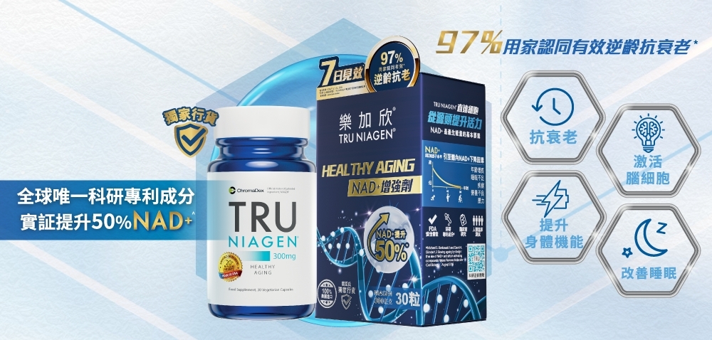 DR. CHARLES BRENNER半生致力進行NAD+諾加因子代謝研究,並創辦美國生物及科技先驅ChromaDex,為大家帶來逆齡科研技術TRU NIAGEN®樂加欣®NAD+增強劑。通過cGMP認可標準及FDA安全確認,符合嚴格標準,並且獲30項獨家專利、超過200項臨床前研究及250項與大學的合作研究,確保品質及安全性。每日1粒TRU NIAGEN®樂加欣®NAD+增強劑,內含300毫克NIAGEN®,有助提升體內NAD+水平,達到抗衰老 1 、激活腦細胞及記憶力 2 、提升身體機能 3、4、5 、6 、改善睡眠7等4大功效。