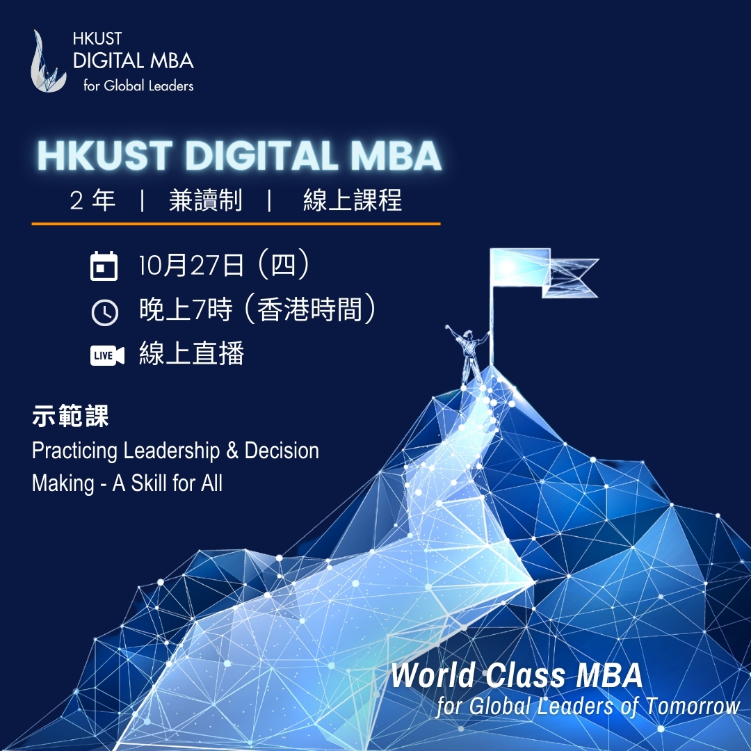 DiMBA課程現已正進行招生,香港科技大學將於10月27日舉辦DiMBA線上說明會,詳細介紹申請需求及課程內容,並設有示範授課,想了解更多科大DiMBA的課程特色,可立即至以下網址報名說明會:https://bit.ly/3CTrLUH