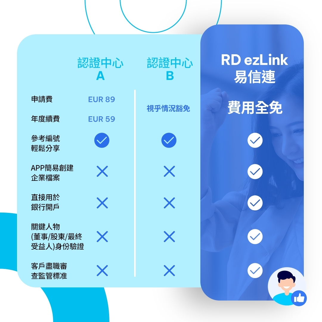 「易信連」與市場上的企業認證中心相比,完美表達快、狠、準。「易信連」企業認證服務申請費及年費全免,一APP便能簡易創建企業檔案,同時提供關鍵人物(董事/股東/最終受益人)身份驗證,做到客戶盡職審查並達到監管機構標準。