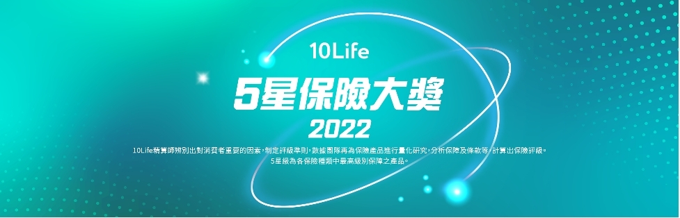 「10Life 5星保險大獎2022」由香港保險比較平台10Life舉辦,10Life團隊會定期主動從各種途徑收集市場上不同的產品資訊,再交由精算師團隊以消費者角度出發,訂立統一量度標準,包括保障、保費(性價比)、條款及細則等等,再以量化方式研究各類產品,從而計算出保險評級。10Life精算師亦會因應市場狀況,不時檢視及修訂評級準則,讓消費者更能緊貼市場,比較並選擇合適自己的保障。