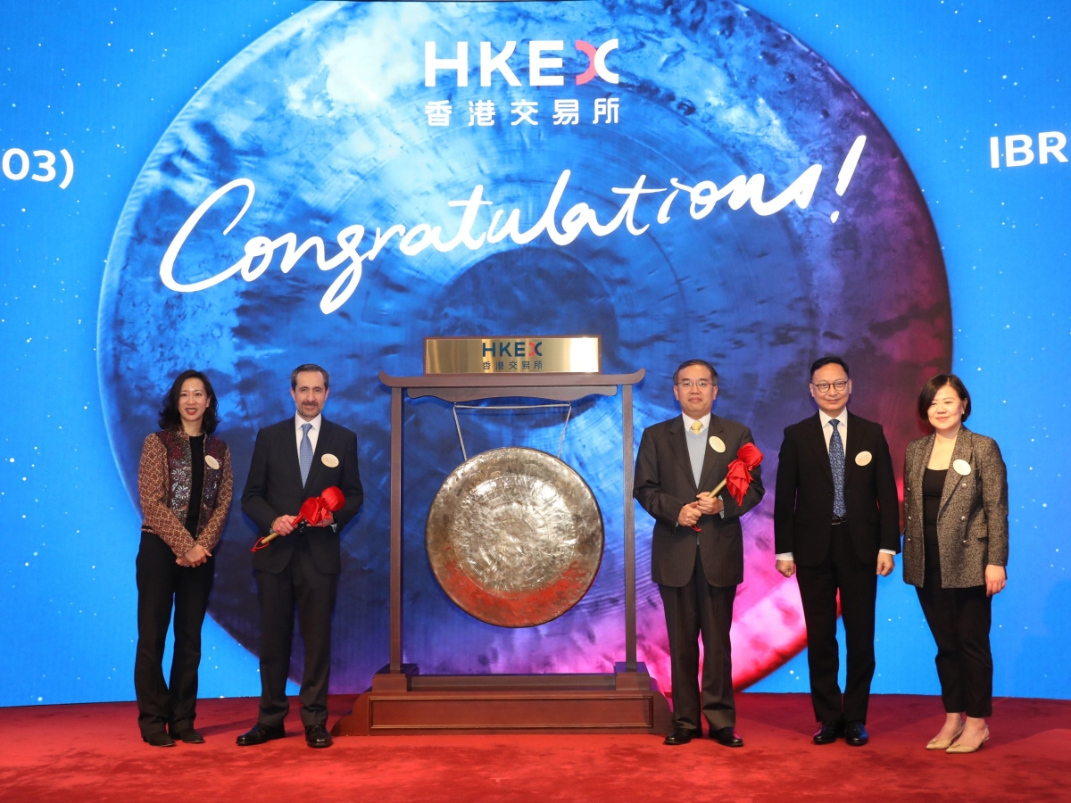 Photo from 「世界銀行巨災(智利地震)債券」在香港聯交所掛牌上市的敲鑼儀式 — 圖片取自特區政府官網