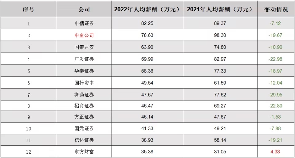內媒《市界投資匯》的統計資料顯示,其他的證券公司的人均薪酬也有明顯的降低,其中海通證券的減幅逼近4成;而招商證券、廣發證券、信達證券的降低幅度皆超過20%。其他降低的薪酬的券商包括國泰君安(-10.9%)、華泰證券(-18.97%)、國元證券(-7.88%)等。