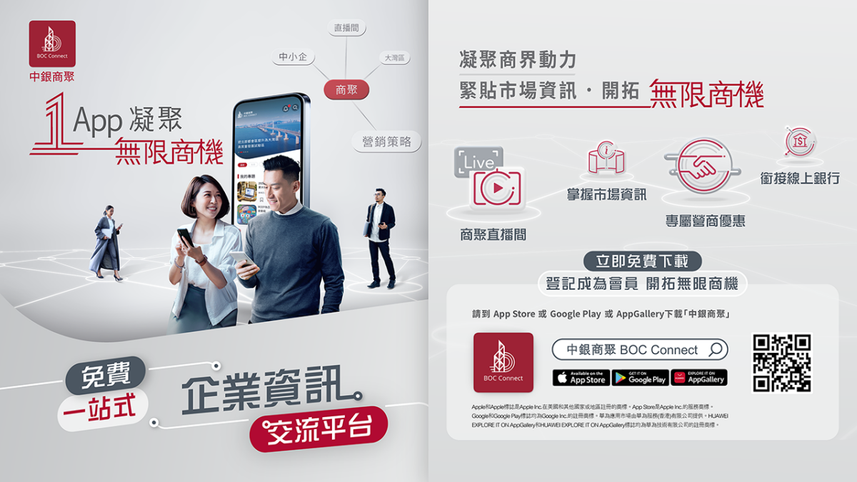 儘管傳統銀行面對數碼轉型時挑戰重重,中銀香港仍能善用自家優勢:憑藉遍佈中國內地之網絡、專業的貿易服務團隊、多元化跨境服務及產品等,線上線下互相配合,創建高效服務,竭力協助中小企拓展業務。最近更推出了免費的企業資訊交流平台—「中銀商聚BOC Connect」流動應用程式,為商家提供緊貼市場、掌握機遇、開拓商機的機會,助企業全面掌握營商優勢。