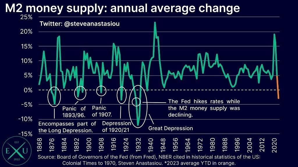 但是美國最新公佈的資料顯示,繼連續9個月下降之後,美國貨幣供應量連續與去年同期相比仍然下降了3.6%。美國6月M2的年平均增長率為-2.7%,這是1933年大蕭條最嚴重時期以來的最大降幅。歷史表明,隨著M2下降,繼續激進的緊縮政策是一個危險的主張,M2貨幣供應量的下降通常與經濟蕭條和恐慌有關。