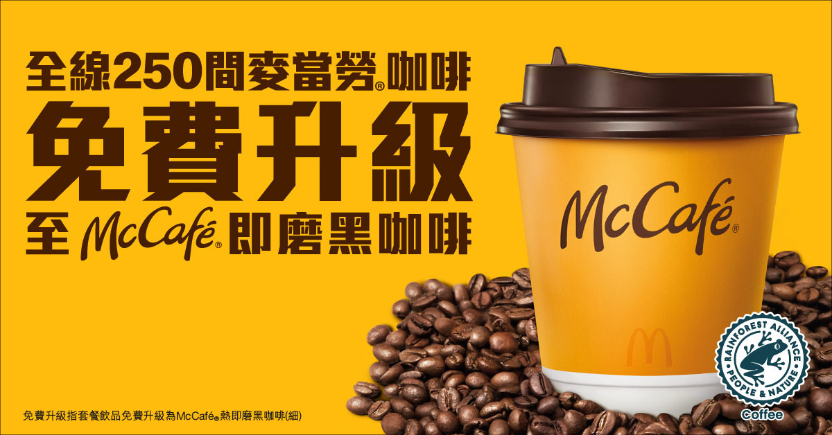 其後麥當勞同日下午再宣佈9月5日起,全線250間麥當勞咖啡升級至 McCafé 咖啡,務求提升顧客的咖啡體驗,更全面升級餐廳的咖啡機、咖啡豆配方及員工訓練,將原本只有130間麥當勞餐廳供應McCafé 咖啡,擴展到全港九新界,以後間間都有得賣。