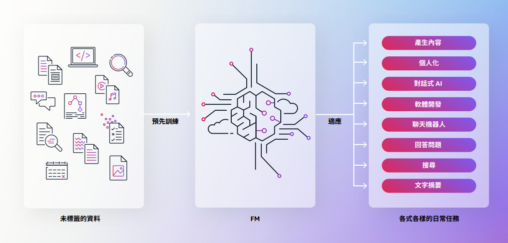 無疑,生成式AI作為現時最前沿的科技,要從頭開始接觸絕不是易事,但相對於從零建立一個新的生成式AI模型,AWS的服務可以提供一個供客製的基礎模型(Foundation Model / FM)。當輸入相關資料供FM訓練適應後,就能學習並模仿現有的數據,以處理相應的任務。例如一間公司需要每天按相關交易產生活動報告,只需提供過住的報告及相應資料,AI就能掌握到如何撰寫該報告。這種訓練適應方式應用範圍甚廣,例如適合公司品牌風格的客戶服務聊天機械人,或產生文章、圖像等等。