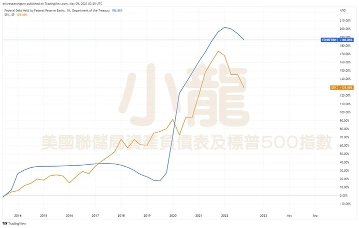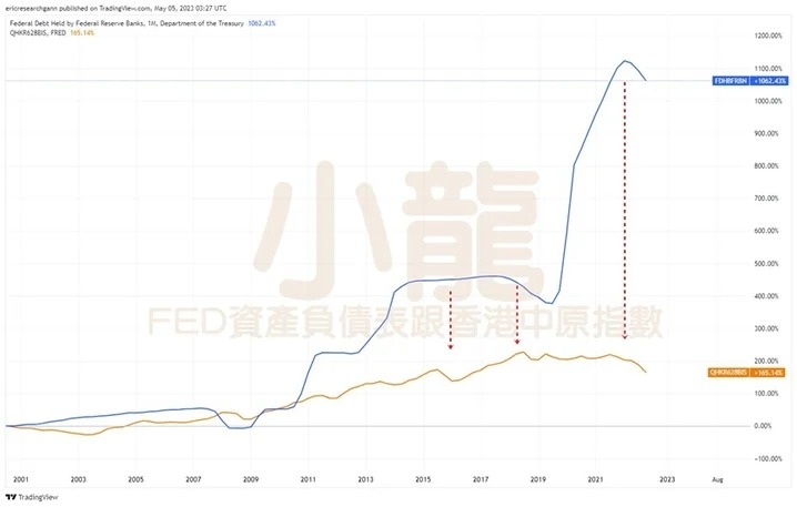 那麼如果上述的論據成立,2023年總共可能會縮減11.4萬億美元(12個月 x 950億美元/月)。而未來3年預計共要縮表約佔目前聯儲局總資產約三分之一,那麼股市會受影響嗎?圖為中原指數及聯儲局資產負債表的圖表,大家可見港樓及聯儲局資產負債表的圖表成正面的影響。