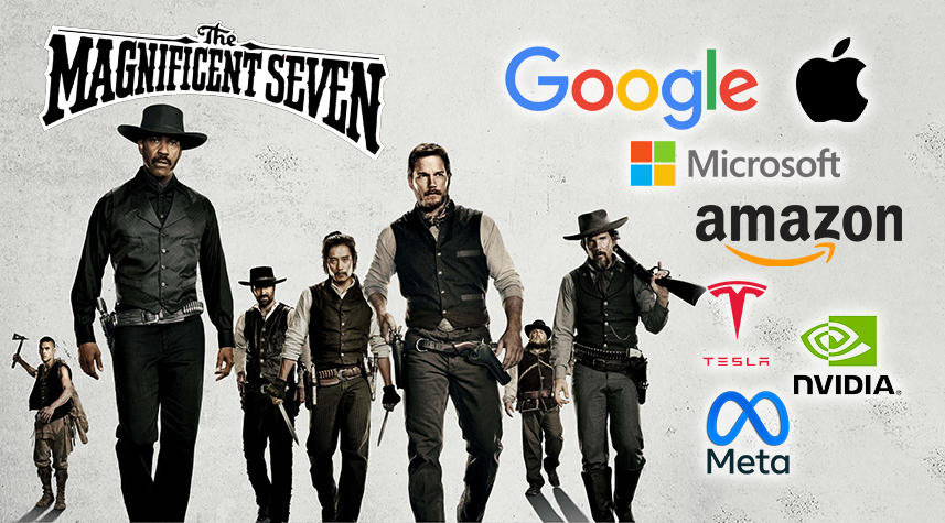 所謂「Magnificent 7」是指美股現時最大市值的7隻科技股,若以市值排名依次為蘋果(美股:AAPL)、微軟(美股:MSFT)、谷歌(美股:GOOG)、亞馬遜(美股:AMZN)、英偉達(美股:NVDA)、META(美股:META)及TESLA (美股:TSLA)。鑑於美股「Magnificent 7」與美國60年著名西部牛仔電影同名(港譯「七俠蕩寇誌」,改編自黑澤明名作「七俠四義」),故也有人把美股市場的「Magnificent 7」譯作美股七雄。