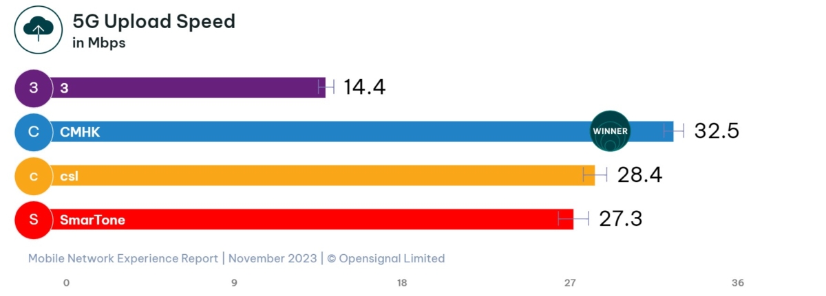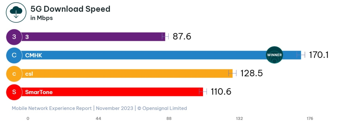 Opensignal為分析消費者流動網絡體驗的獨立國際權威機構。根據Opensignal於今年11月最新發佈的「香港流動網絡用戶體驗報告」中,CMHK成功蟬聯5G網絡下載速度(5G Download Speed)和5G網絡上載速度(5G Upload Speed)第一,下載及上載速度分別達170.1Mbps及32.5Mbps,大幅領先同儕。此外,CMHK同樣於整體網絡上載速度體驗(Upload Speed Experience)2取得第一,而整體網絡下載速度體驗(Download Speed Experience)亦取得領先成績,四大速度3俱名列前茅。綜合今年5月Opensignal發佈的同類型報告,當時CMHK於5G網絡上載及下載速度均獲得最高評分,CMHK5G全港速度No.1實至名歸。