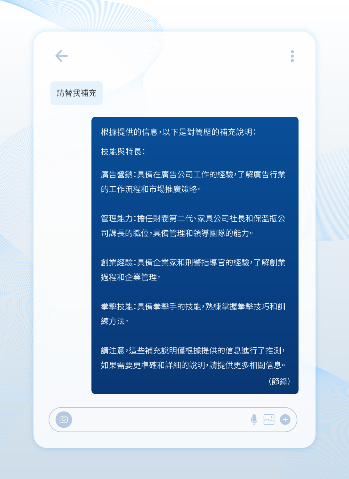 雖然已經可以按AI的回答去改寫,但似乎和網上尋求幫助分別不大,筆者就再輸入另一個指令——「請替我補充」。要是問真人當然失禮,不過AI不但沒有怪罪筆者,反而為筆者歸納出「木村」的技能和特長。