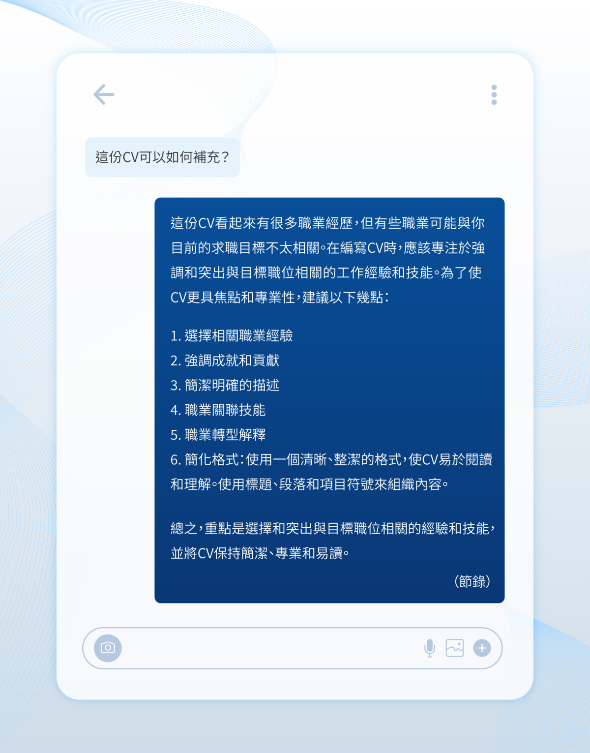 為了測試生成式AI的能耐,筆者輸入的指令都盡量虛浮。第一個指令為「這份CV可以如何補充」,從下圖可見,即使虛浮,AI也盡量提供有用資訊,和Fanny的專業意見相近。
