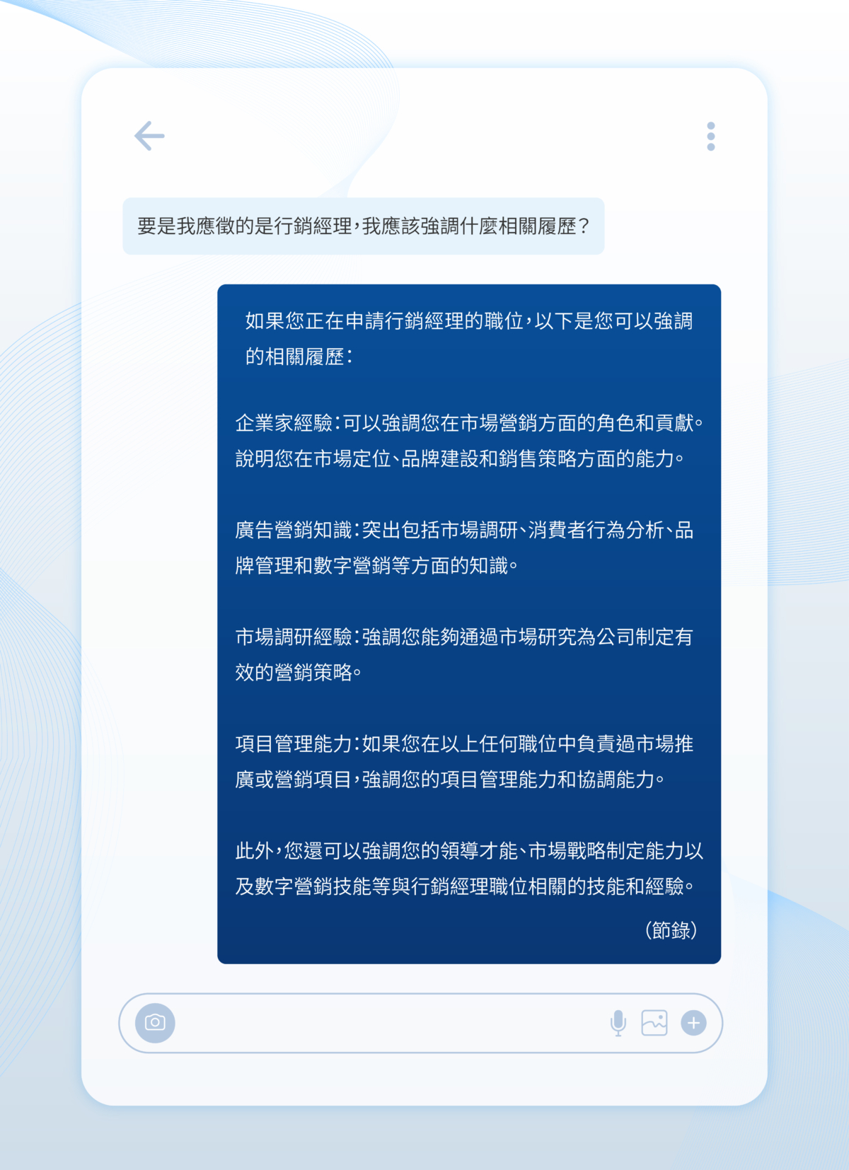 最後一個測試指令就模擬實際狀況,輸入「要是我應徵的是行銷經理,我應該強調什麼相關履歷?」筆者跟AI的建議去改寫,再交由Fanny評價,全程只用了11分鐘。
