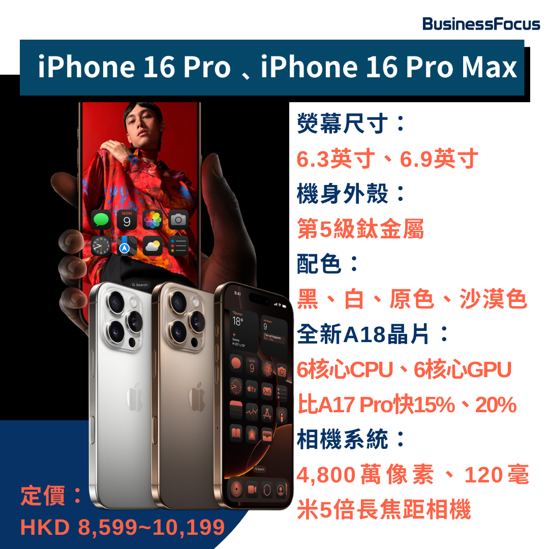 另外兩款Pro系列的iPhone 16 Pro和iPhone 16 Pro Max,熒幕尺寸分別增大至6.3英寸和6.9英寸,機身外殼材料升級至Apple產品史上最輕薄的第5級鈦金屬,配色有黑、白、原色,以及最新的沙漠色。同時,Pro系列所還搭載了更強大的A18晶片,擁有6核心CPU和6核心GPU,性能比前代A17 Pro分別提升了15%和20%,並擁有最佳的電池續航能力。對比標準版,Pro版主鏡頭配備4,800萬像素超廣角及長焦距相機,支持2,400萬像素及4800萬像素的超高解像度相片。另配備120毫米5倍長焦距相機,支持4K 120fps HDR影片錄製,且同樣加設了觸覺回饋功能按鈕。
