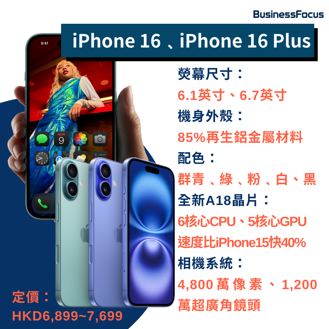 本次iPhone 16系列將推出4款機型,其中iPhone 16及iPhone 16 Plus熒幕尺寸分別加大至6.1英寸和6.7英寸,機身外殼採用了85%再生鋁金屬材料,配色有群青色﹑湖水綠色﹑粉紅色﹑白色及黑色。性能上,標準版搭載了全新的A18晶片,分別擁有6核心CPU及5核心GPU,速度比iPhone 12快60%、比iPhone 15快40%。