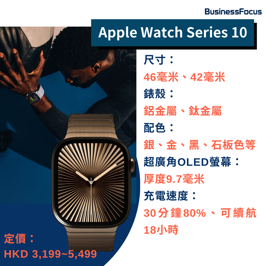 今年正好是Apple Watch發布10周年,本次新推出Apple Watch Series 10及Apple Watch Ultra 2備受關注。其中Apple Watch Series 10分別有46毫米、42毫米兩款鋁金屬(銀色﹑玫瑰金色﹑亮黑色)或鈦金屬(原色、金色、石板色)錶殼,並搭載了超廣角OLED螢幕,厚度僅達9.7毫米,為史上最大螢幕和最纖薄設計。另外,其「Reflections」的錶面設計會自動根據周圍環境光產生變化,充電速度提升至目前最快的30分鐘80%,可續航長達18小時。而Apple Watch Ultra 2則採用49毫米鈦金屬錶殼,配色有黑色及原色,可續航長達36小時。