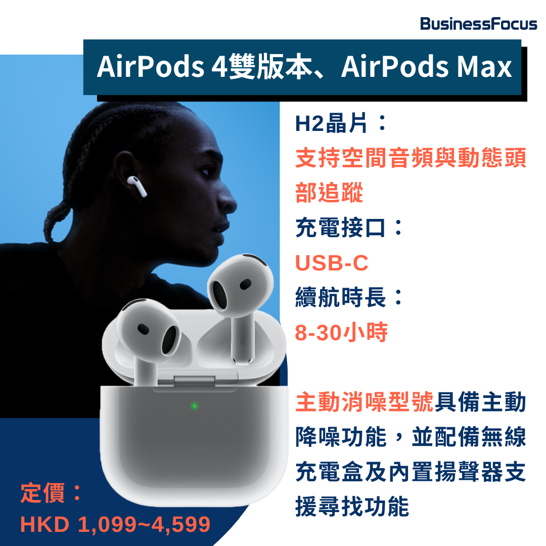 本次發布會的另外一大亮點AirPods,最新款分別是AirPods 4雙版本及AirPods Max頭戴式耳機。AirPods 4雙版本外觀並無太大改變,由H2晶片支持空間音頻與動態頭部追蹤,其中一款具備主動降噪功能,並配備無線充電盒及內置揚聲器支援尋找功能。電池續航方面亦有所提升,一次充電可提供8小時的播放時間,配合充電盒使用總續航時間可達30小時。兩款AirPods統一支持USB-C充電接口,現已開放預訂,將於9月20日發售。定價方面,標準版AirPods起價為港元1,099,主動消噪型號起價港元1,499,AirPods Max頭戴式耳機起價則為港元4,599。
