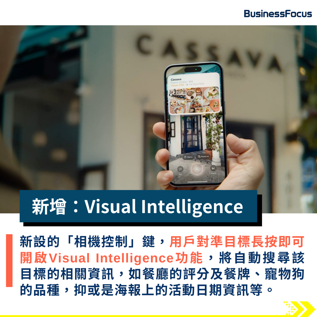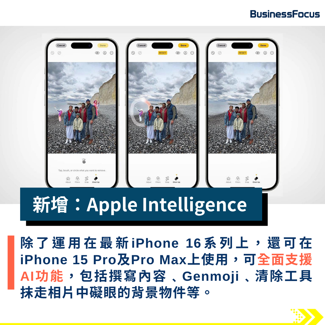 至於本次產品的核心亮點Apple Intelligence,除了運用在最新iPhone 16系列上,還可在iPhone 15 Pro及Pro Max上使用,可全面支援AI功能,包括撰寫內容﹑Genmoji﹑清除工具抹走相片中礙眼的背景物件等。另外,新設的「相機控制」鍵,用戶對準目標長按即可開啟Visual Intelligence功能,將自動搜尋該目標的相關資訊,如餐廳的評分及餐牌、寵物狗的品種,抑或是海報上的活動日期資訊等。