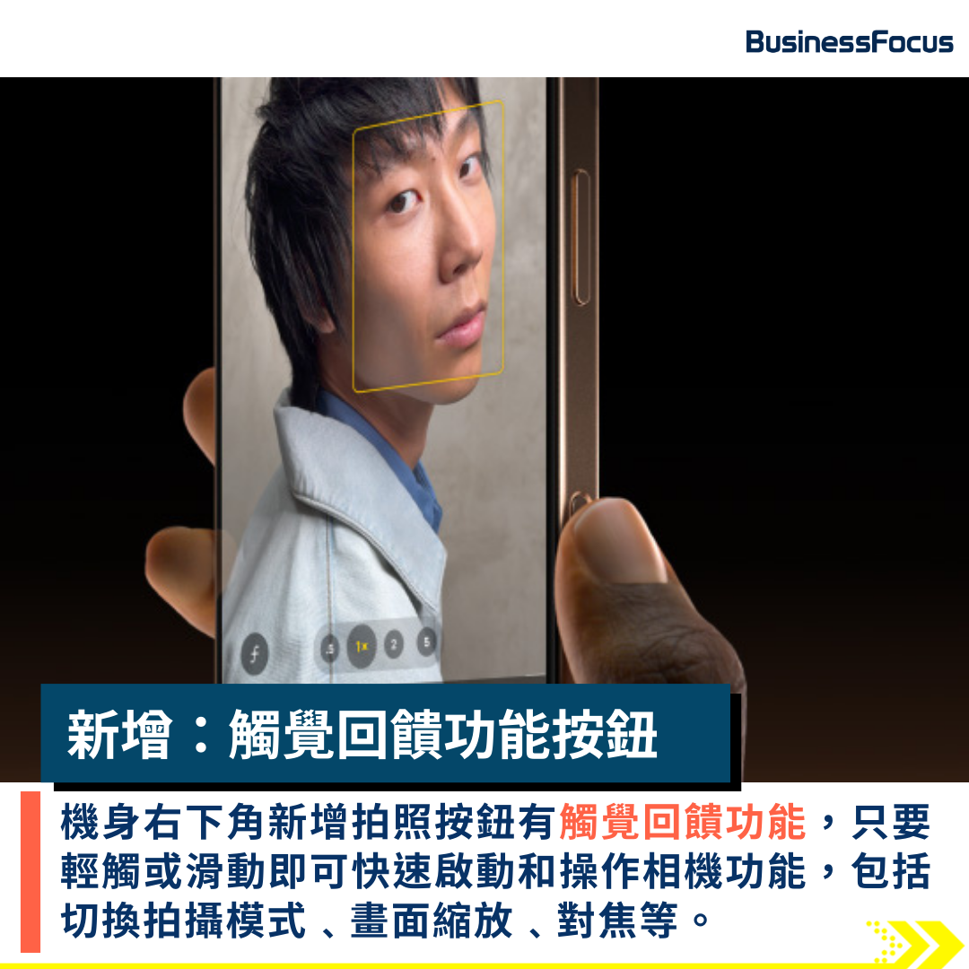 相機系統方面,標準版iPhone 16主鏡頭為4,800萬像素相機,加入1,200萬超廣角鏡頭,支持2,400萬像素及4,800萬像素的超高解像度相片,並在機身右下角新增拍照按鈕有觸覺回饋功能,只要輕觸或滑動即可快速啟動和操作相機功能,包括切換拍攝模式﹑畫面縮放﹑對焦等。