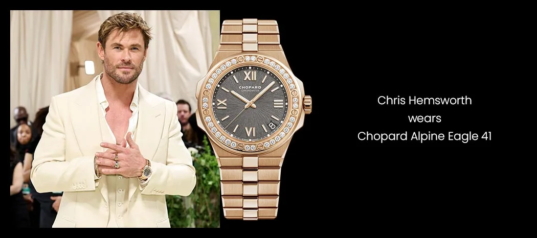 這款Alpine Eagle雪山傲翼腕錶系列,靈感來自阿爾卑斯山脈和雄鷹的堅毅力量,彰顯運動時尚風格,錶圈鑲滿了精美鑽石,搭配18K玫瑰金錶帶,顯得格外耀眼,不愧對Chris Hemsworth專業腕錶收藏家的稱號。目前在官網上已找不到同款,類似規格的彩鉆金腕錶售價為7.86萬美元(約61萬港元)。