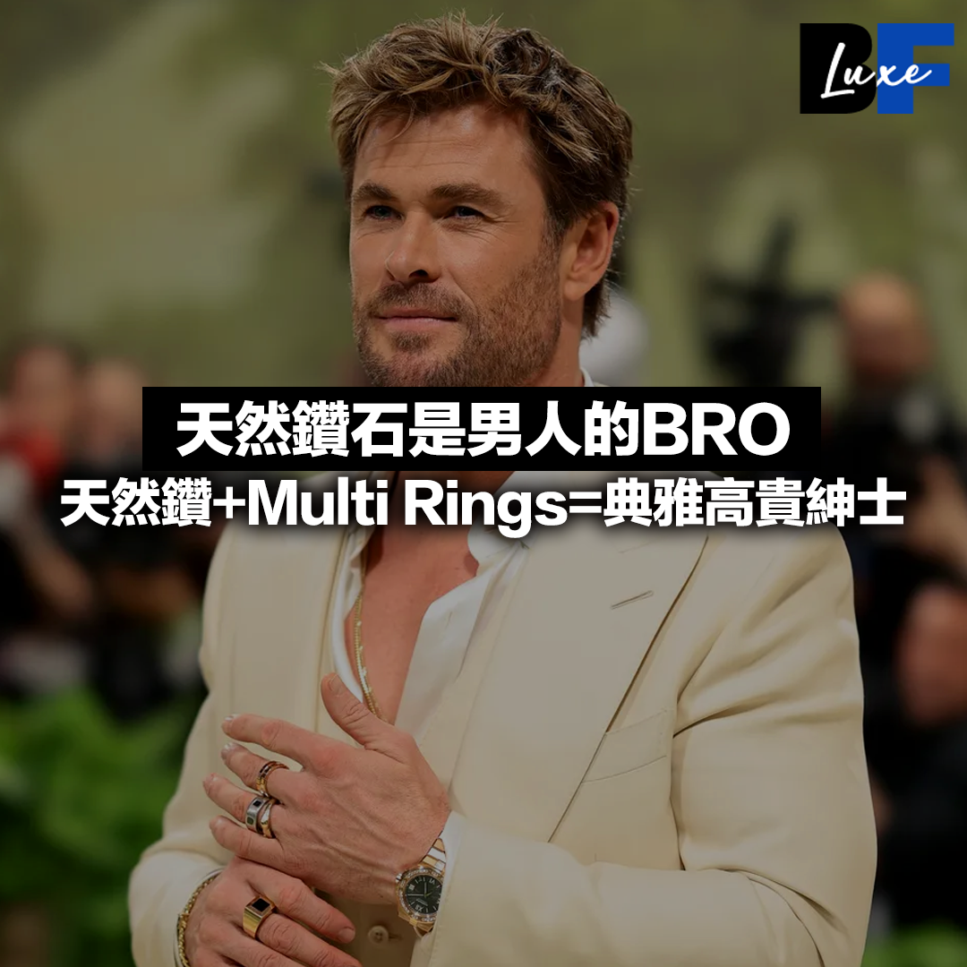 Chris Hemsworth以簡約的Tom Ford米白色羊毛西裝、敞開白襯衫上身,並採用了multi rings潮流穿搭法,以兩枚Ice Cube系列的18K玫瑰金戒指,以及一枚來自Haute的鑲有縟瑪瑙的18K玫瑰金戒指,襯托精美鑽錶。整體穿搭以白金為主色,帶出斯文的感覺,盡顯精緻和優雅。