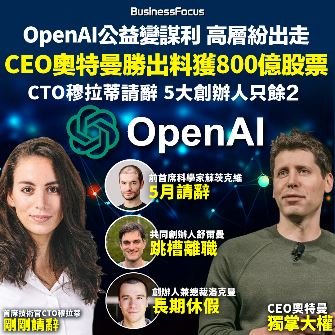 OpenAI估值漸升至1,500億美元的天價,公司亦疑「變質」,董事會有意把公司由非牟利公司變利營利機構,加上其皇牌AI產品ChatGPT發展太急進,疑引發公司聯合創辦人紛紛出走,最新離職的OpenAI高層為首席技術官(CTO)穆拉蒂(Mira Murati)。雖她聲稱離職是因為個人理由,包括希望獲得更多時間及空間,但連同她在內,OpenAI五大創辦人及高層在半年之內已有3人離開。現時只餘下行政總裁奧克曼(Sam Altman)控制公司,至於公司總裁即另一創辦人舒爾曼(Greg Brockman)近月則長期休假,意向未明。