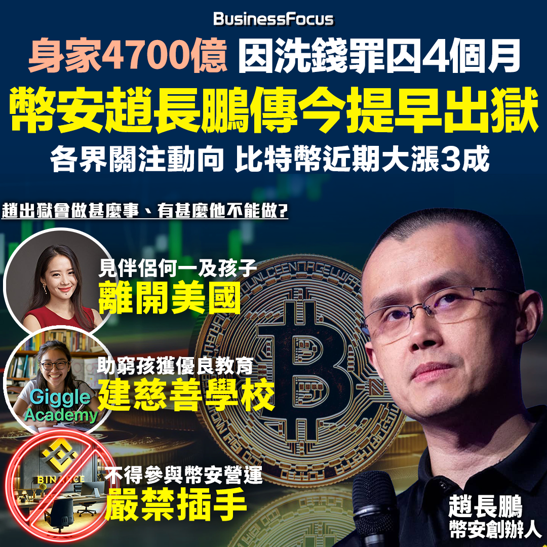 【加密幣大亨出獄】身家4700億 因洗錢罪囚4個月 幣安趙長鵬傳今提早出獄 比特幣近期大漲3成 趙出獄後第一件事會做甚麼?