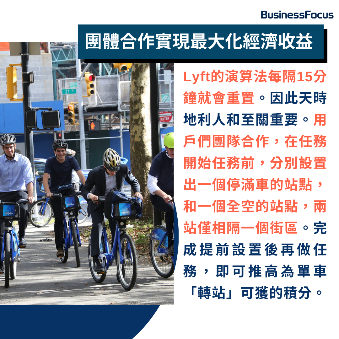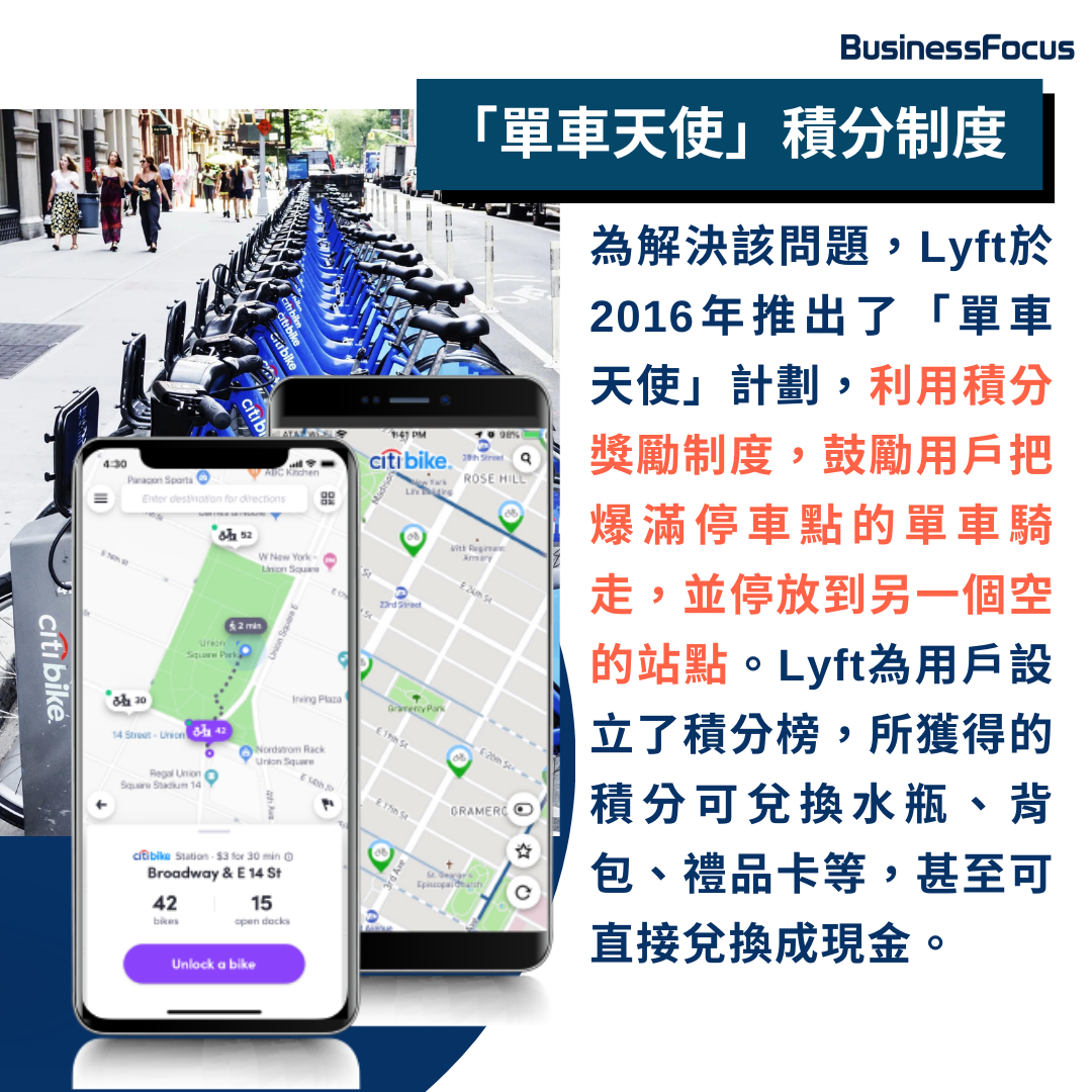 為解決該問題,Lyft曾僱傭卡車司機負責轉移停車過量站點內的單車,但效果甚微。直到2016年,該平台推出了「單車天使」計劃,利用積分獎勵制度,鼓勵用戶把爆滿停車點的單車騎走,並停放到另一個空的站點。Lyft為用戶設立了積分榜,所獲得的積分可兌換水瓶、背包、禮品卡等,甚至可直接兌換成現金。