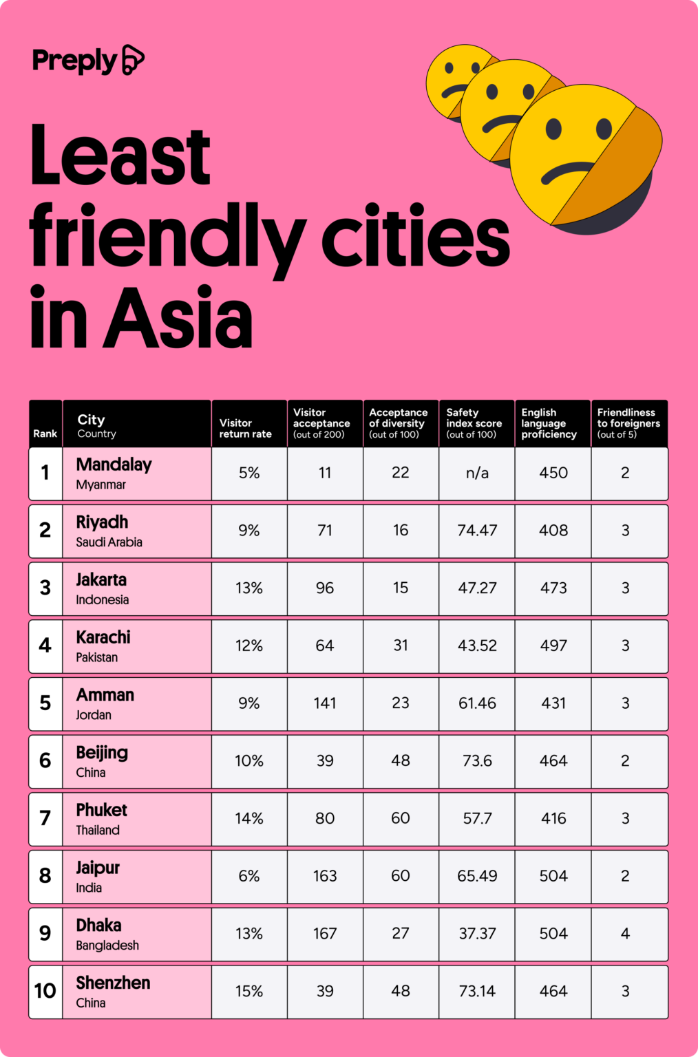 另外,Preply同時公布了「亞洲最不友善城市」排行榜,由緬甸第二大城曼德勒奪冠,其餘上榜的城市依序為沙特利雅得、印尼雅加達、巴基斯坦卡拉奇、約旦安曼、中國北京、泰國布吉、印度齋浦爾、孟加拉達卡及中國深圳。