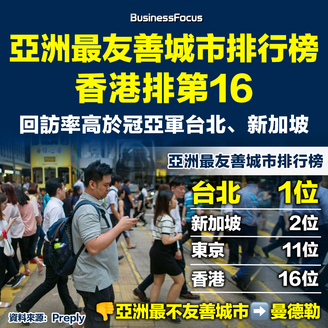 亞洲最友善城市排行榜 香港排第16 回訪率高於冠亞軍台北、新加坡