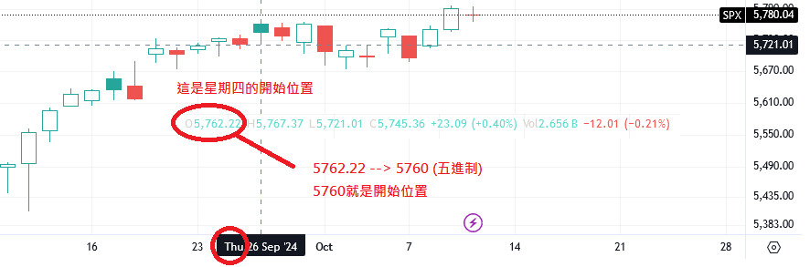 首先,筆者每一個周期會在星期四開市位置(需要5進制開市位置)至下星期五收市前留意SPX(標普500指數)走勢,如果曾經上升47.5點,策略上便會追入市場(買入),而賣出就會在周期尾的星期五。所以第一個周期就是9月26日開始,而開始位置就是5760點(圖A),在9月26日(星期四)到10月4日即下星期五就是第一個周期。