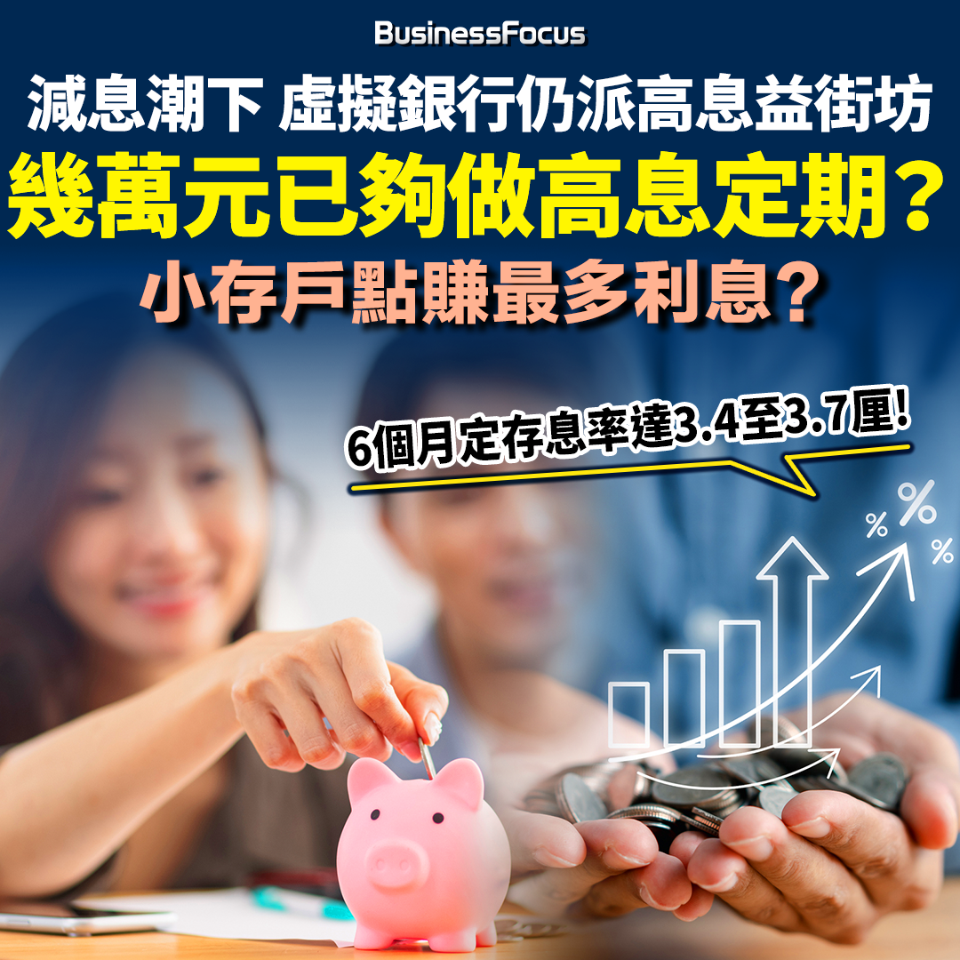 香港大銀行近日不斷削減定期息率,只餘下存款額達50萬甚至100萬以上尊貴客戶才容易享受高息,難免令小存戶傷心。不過BusinessFocus記者格價後發現(截至10月17日下午),部分虛擬虛銀行及中小型銀行仍然「大開高息之門」,並為6個月的港元定期存款提供3.3厘至3.7厘的高息(匯立銀行,星展銀行及天星銀行),少至數萬元甚至數千元的定期存款,一樣可享受高息。加上香港銀行存款保障額最近已由50萬提升至80萬港元,故香港存戶大可放心把較大筆積蓄存放於虛擬銀行或中小型銀行賺息,再視乎美國之後會否真的大幅減息,才決定下一步投資行動。
