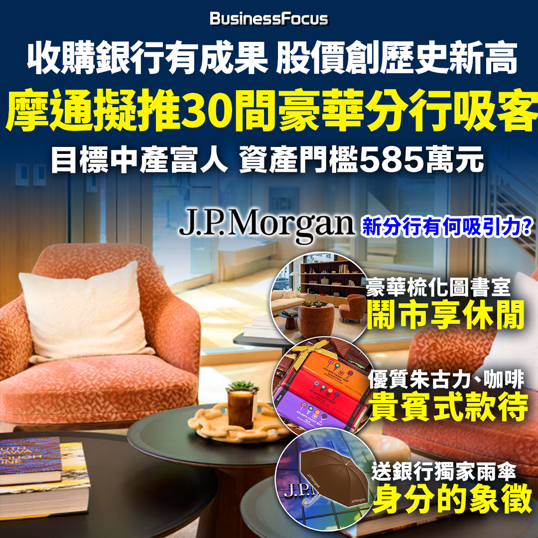 摩根大通(JPM)2023年在美國銀行業危機中,以低價收購了近乎倒閉的第一共和銀行系,成功增加不少大客令業績更強,其股價周四盤中更創出225.85美元的歷史新高。摩通疑為令業績更上一層樓,最新目標為資產在75萬美元(約585萬港元)的「富裕大眾(mass affluence)」。為留住及增加這些超級中產富人客戶,摩通準備在2026年底前在全國開設30間稱為「金融中心」的特級分行,這些分行除有專人服務「富裕大眾」,更配備豪華梳化,還有免費的優質咖啡、特色朱古力等,務求令客戶感高人一等,留住他們的心。