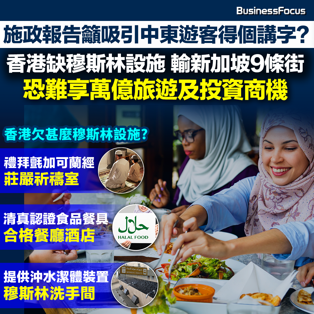 香港旅遊零售俱不振,特首李家超最新施政報告提到要「打造香港旅遊新面貌」,其中包括發展中東及東盟巿場,更建議的士車隊提供阿拉伯語服務資訊,暗示的士司機可考慮何阿拉伯語,惹來全城熱議。不過不少中東及東盟遊客都是信奉伊斯蘭教的虔誠穆斯林(教徒),記者卻發現香港的穆斯林友善設施包括合格洗手間、祈禱室及清真認證餐廳均嚴重不足,故單以基建而論,擁30萬穆斯林人口的香港「輸新加坡9條街」。此外香港旅遊景點不足,亦對全球20億穆斯林的吸引力大打折扣。而民建聯上月其實亦已公開倡議香港在各方面急起直追,藉改善旅遊設施,令香港可擴大穆斯林商機如旅遊業及吸引海外投資,使香港經濟受惠。
