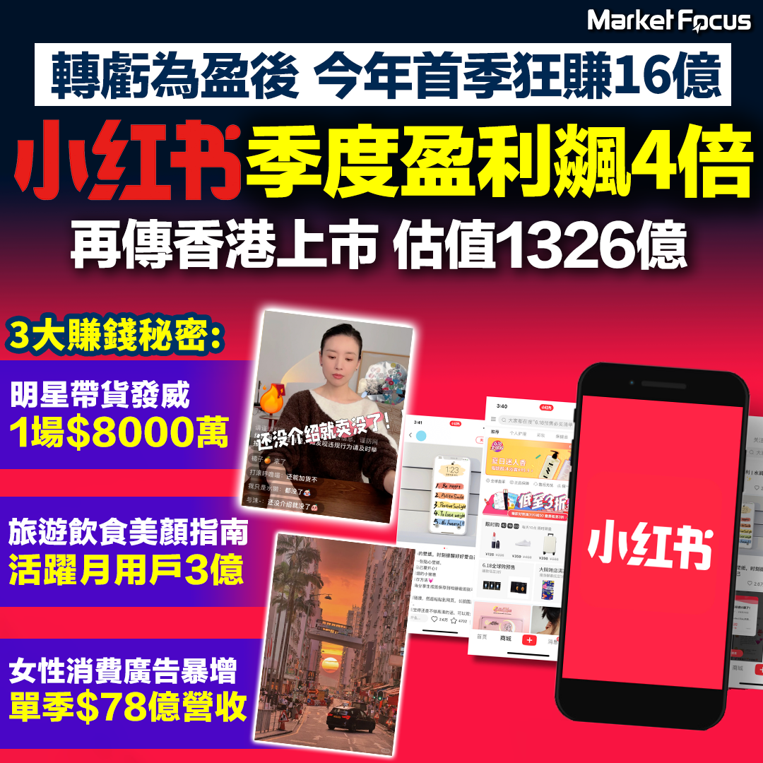 【小紅書天下】轉虧為盈後 今年首季狂賺16億 小紅書季度盈利飊4倍 再傳香港上市 估值1326億 3億用戶加明星帶貨助扭轉逆境