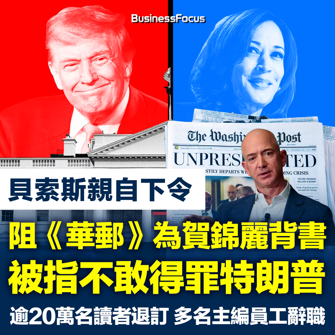 【2024美國總統大選】貝索斯親自下令阻《華郵》為賀錦麗背書 被指不敢得罪特朗普 遭逾20萬名讀者退訂 多名主編員工辭職