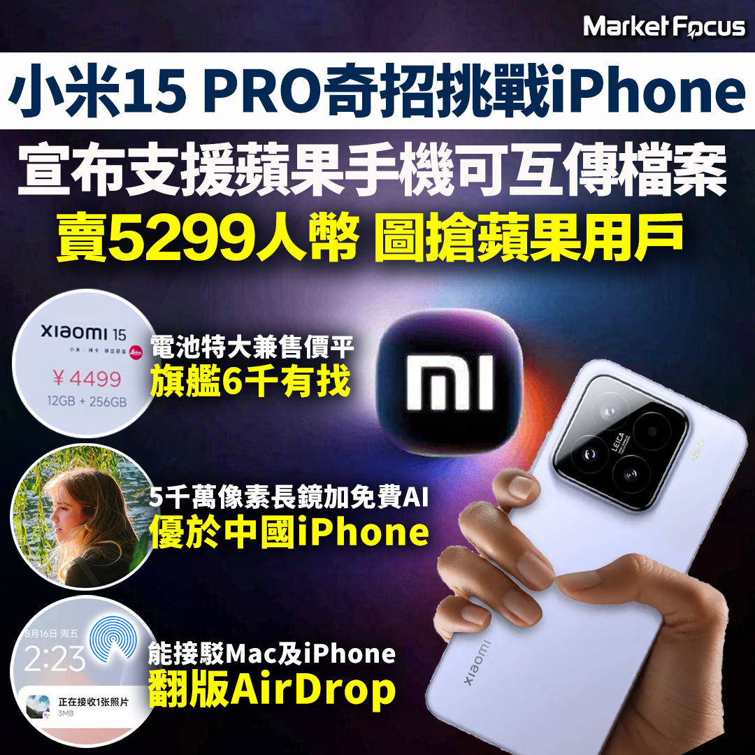 【雷軍出手】小米15 PRO奇招搶iPhone用戶 宣布支援蘋果系統兼送免費AI 「翻版」AirDrop可與iPhone互傳檔案 挑戰蘋果爭做手機銷量一哥