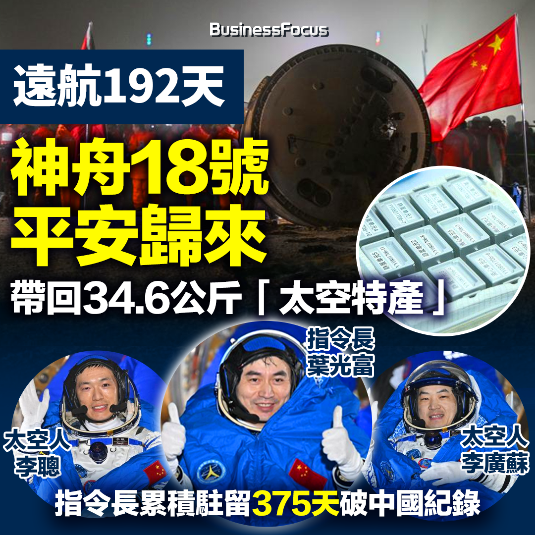 央視報道,中國神舟18號載人飛船昨日安全著陸地球,3名太空人葉光富、李聰、李廣蘇完成將近7個月的「太空出差」,重返家園,並帶回總重量約34.6公斤的「太空特產」。據悉,本次太空任務刷新了中國太空史的多項紀錄,包括在太空駐留最長時間的紀錄,太空人單次出艙活動時間紀錄等,指令長葉光富更打破中國累計飛行時長紀錄,成為首位駐留太空超過一年的太空人。