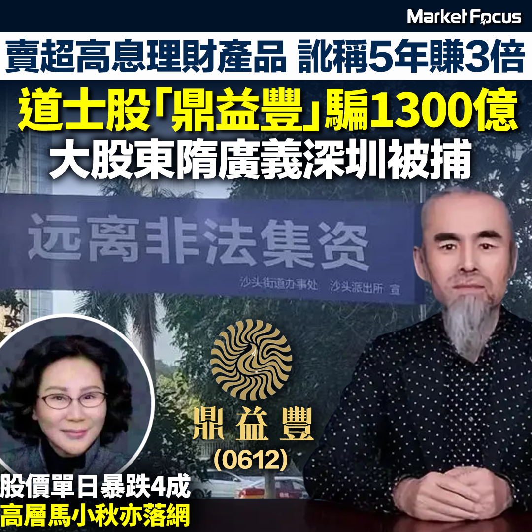 【貪字得個貧】賣高息理財產品 訛稱5年賺3倍 道士股「鼎益豐」涉騙1300億人幣 大股東隋廣義深圳被捕 股價暴跌4成 高層馬小秋亦落網