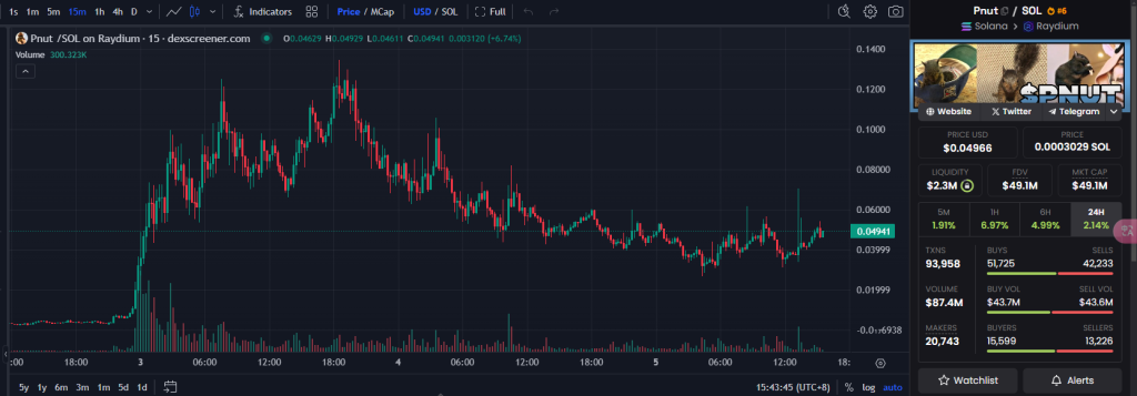 受事件影響,自11月2日開始,Peanut的同名Meme幣「Pnut」價格由0.003附近開始暴漲,最高來到 0.1348美元,其市值也在11月3日突破1.1億美元(約8.58億港元),一些浣熊、大象等類似概念的動物MEME幣價格亦隨之暴漲。不過,根據Gecko Terminal數據,目前PNUT的市值已降至4,900萬美元左右,熱潮正在降溫,其價格在初始飆升後趨於穩定。